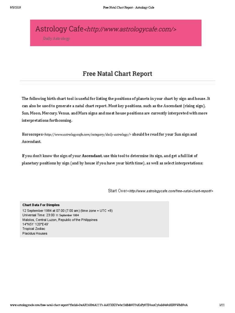 Cafe Astrology Expert Review - When How and What You can get a free natal chart report by entering your birth date and time. Find out your rising sign, planet signs and houses, and aspects—and what they mean—and how they affect you. Our interpretations, as well as those from Cafe Astrology, appear in the report. Personal horoscopes and transit reports are also included in the service. Understanding a birth chart in astrology and how to read one Each house in your chart — ranging from First (Ascendant) to Seventh (Descendant) to 10 th (Midheaven) and reaching completion at 12 — is ruled by a zodiac sign. That is why you have all ...