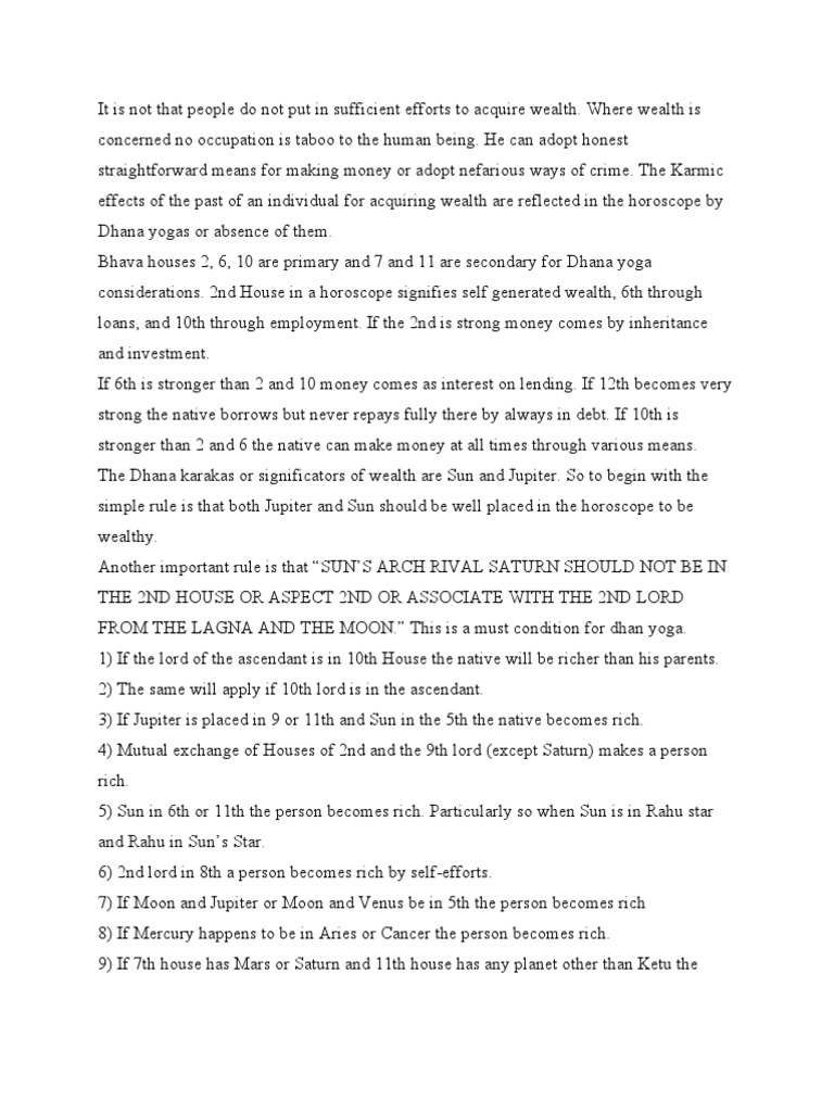 10 Dhana yogas in Astrology which make you Rich! This is a very good Dhana Yoga in Astrology. 2. If there is Mars or Saturn in the seventh house or if any planet other than Rahu is present in the eleventh house, then the person is likely to gain...