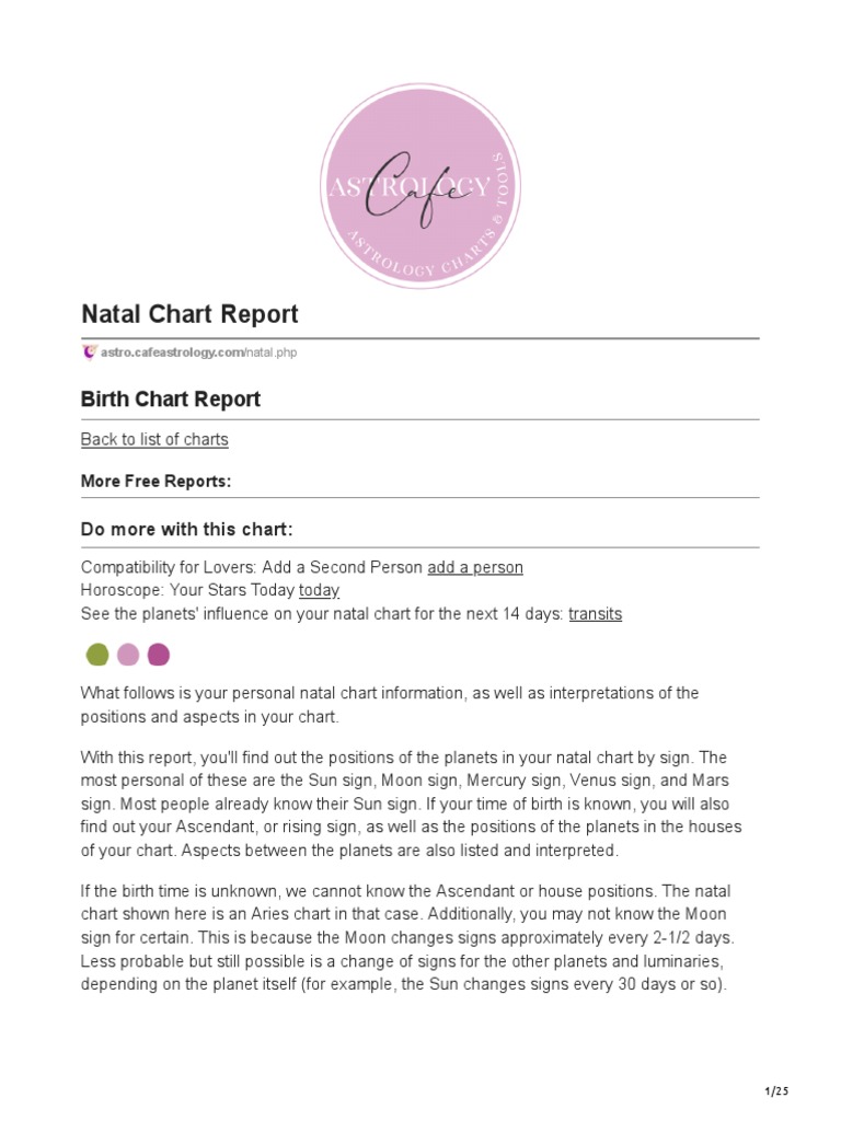 Free Natal Chart Report | Cafe Astrology .com Free Natal Chart Report | Cafe Astrology .com Free Natal Chart Report The following free birth chart tool lists planet signs, house positions, and aspects. It also allows you to compare multiple house systems. (The default house system is Placidus). Natal Chart Report Natal Chart Report Birth Chart This birth chart report shows the positions of the planets for . The Sun The Sun represents vitality, a sense of individuality, and outward-shining creative energy. The Sun is in Leo There's an unmistakably regal air to Solar Leos. These are dignified--even noble--folk. Free Natal Chart Report - Astrology Cafe It can also be used to generate a natal chart report. Most key positions, such as the Ascendant (rising sign), Sun, Moon, Mercury, Venus, and Mars signs and most house positions are currently interpreted with more interpretations forthcoming. Horoscopes should be read for your Sun sign and Ascendant. Where to Get a Birth Chart for Free - InStyle This iOS and Android compatible app allows you to plot your birth chart for free and includes analysis for your sun, moon, and rising signs, as well as Venus, which "determines how and what you...