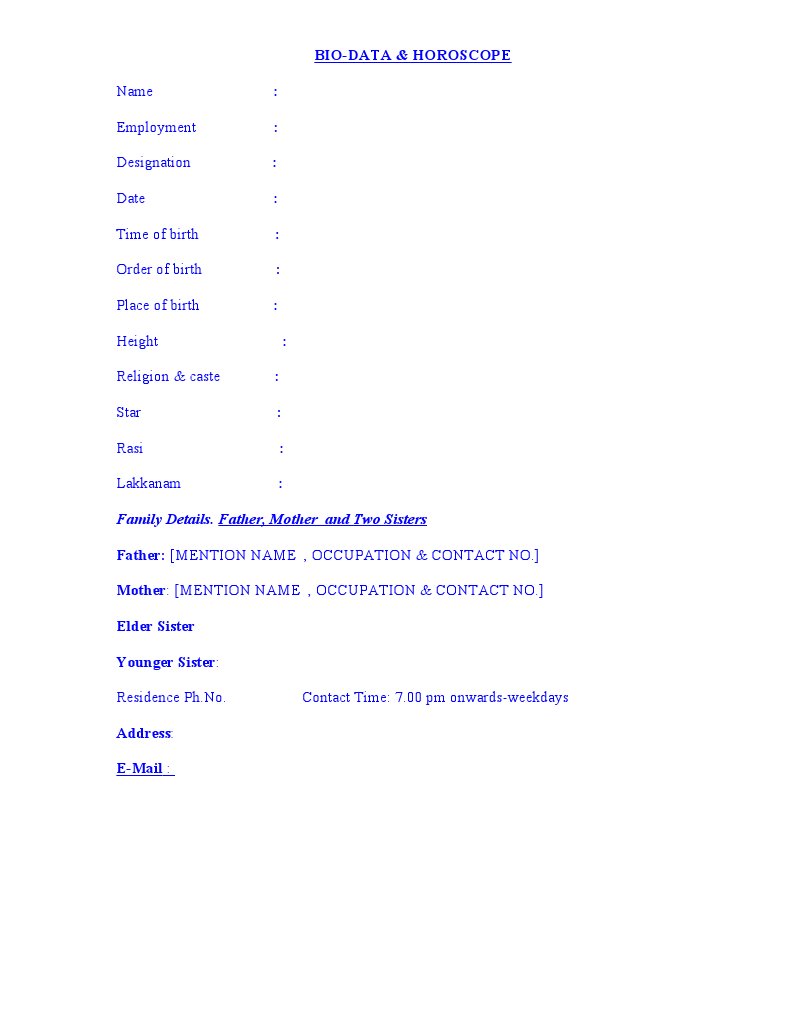 Tamil Marriage Biodata Format - Download Word Templates for Free! This is a simple, 1-column Tamil marriage biodata format with a space to write about yourself and expectations. Click the image below to download this Tamil biodata in Word format. Here is a sample biodata created using this format. The content in Tamil language is available below so you can copy and modify it for your Tamil biodata for marriage.