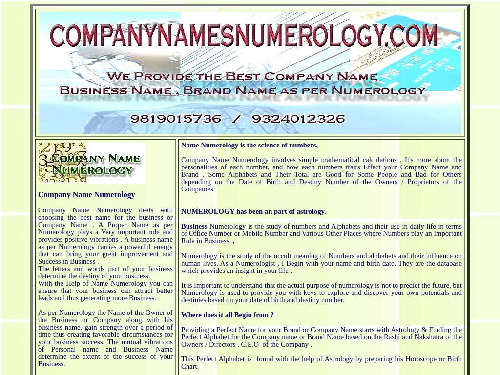 Choose Your Business Name By Numerology - AstrologyMag.com Whether it is your name or your child's name, or your business name, it shows a direct impact on the future, talent, mood, abilities, features, and shortcomings. Numerology is a fantastic science, and it is a belief that proves everything in the universe is created with numbers. Choosing a Business name by numerology: Business is not a small ...