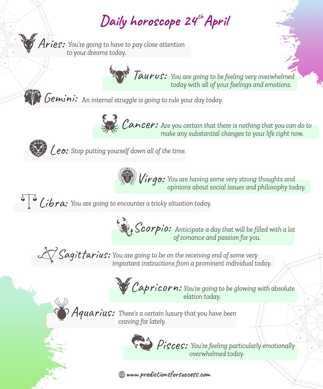 Astrology News, Daily Horoscope by Date of Birth, Zodiac Predictions ... Astrologers use the positions of the sun, moon, and other celestial objects at the time of birth to make predictions. As far as the zodiac signs are concerned, there are 12, namely, Capricorn, Aquarius, Pisces, Taurus, Gemini, Cancer, Virgo, Leo, Libra, Scorpio, Sagittarius. So, get to know information about your zodiac sign and gain insight ...