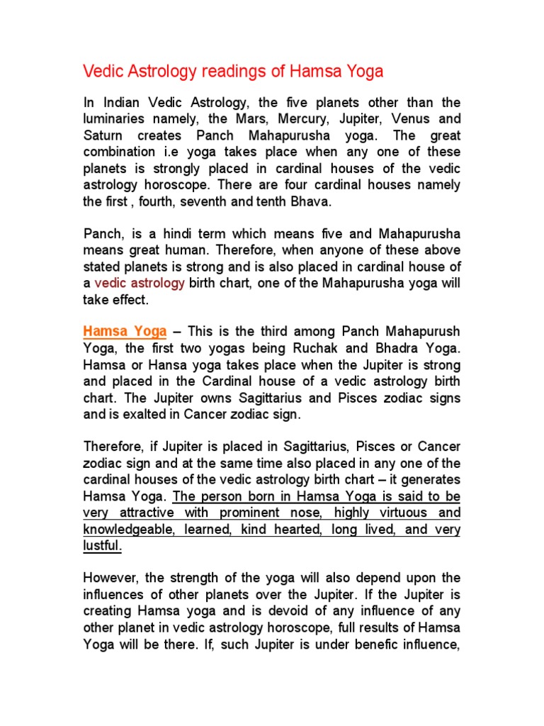 Hamsa Yoga in Vedic Astrology - Vedic Astrology Lessons Hamsa Yoga In Sanskrit Panch means Five, Maha means great and Purush means man (individual). The Yoga is formed by five planets Mars, mercury, Jupiter, Venus or Saturn. Any of these five planets in it's own sign, Mool Trikona or exalted in a kendra (quadrant) which is 1, 4, 7 and 10 th house. What does Hamsa yoga in Vedic Astrology mean? - Quora Hamsa Yoga: Here the word Hamsa means "Swan", symbol representing the purity of the soul. Yoga means "combination". Hamsa Yoga in Jyotish - Vedic Astrology: This yoga is formed when Jupiter occupies a Kendra (quadrant house ie. 1, 4, 7 and 10th house) which must be his own zodiac sign (Sagittarius or Pisces) or exaltation sign (Cancer). › dailypanchangadarshiniPanchangam for Today - Astrojyoti: Tithi, Vara, Nakshatra, Yoga and Karana are the five elements of time called panch-anga. These are based on the positions of Sun and Moon – the two important luminaries - and are used to know the auspiciousness of any date and time (muhurtha) for any important undertaking like journey, buying, selling, marriage, puja, vrata, shraddhas, etc.