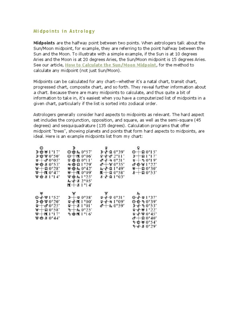 Midpoints in Astrology | PDF | Planets In Astrology | Horoscope - Scribd Midpoints in Astrology. Midpoints are the halfway point between two points. When astrologers talk about the Sun/Moon midpoint, for example, they are referring to the point halfway between the Sun and the Moon. To illustrate with a simple example, if the Sun is at 10 degrees Aries and the Moon is at 20 degrees Aries, the Sun/Moon midpoint is 15 degrees Aries. Midpoint - Astrodienst Astrowiki Every pair of horoscope factors has two midpoints: a so-called near midpoint directly between the factors involved and a far midpoint situated 180 degrees opposite. The former is considered to be the main one. A midpoint marks the focal point at which the energies of two planets meet. If a third planet is conjunct this point it receives these ... Midpoint (astrology) - Wikipedia Midpoint (astrology) A midpoint is a mathematical point halfway between two stellar bodies that tells an interpretative picture for the individual. There are two types of midpoints: direct and indirect. A direct midpoint occurs when a stellar body makes an aspect to the midpoint of two other stellar bodies with an actual physical body at the ... Midpoints in Astrology Midpoints in Astrology. Introduction. Many people are aware of the history and techniques that relate to the calculation and use of the Arabic Parts, in particular the Part of Fortune, but fewer people fully utilise the system of midpoints that Western Astrology has used and developed over many hundreds of years. Midpoints serve to locate areas ...