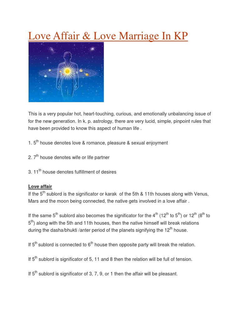 Marriage Predictions in KP Astrology | Love Affairs/ Break ups / Delay The 2H, 7H, 11H will give marriage in its planet timeline. · The 2H is an addition to the family lineage. · The 5H is a love affair, likes, and hobbies. · The 7H ... Will I have Love marriage or arranged? KP Analysis - AstroVidhi LOVE MARRIAGE: The rule as per KP for success in love affairs is that “if the 5th cuspal sublord is a significator of 7th or 11th cusp then there will be ...
