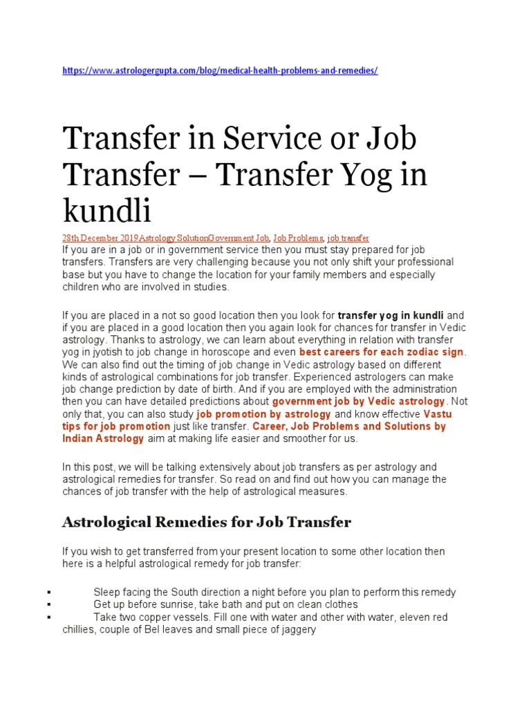 Transfer in Service or Job Transfer | Transfer Yog in kundli If you wish to get transferred from your present location to some other location then here is a helpful astrological remedy for job transfer: Sleep facing the South direction a night before you plan to perform this remedy Get up before sunrise, take bath and put on clean clothes Take two copper vessels.