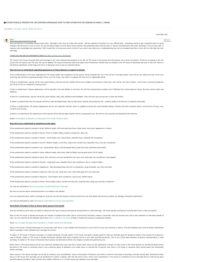 Marriage Astrology-Future Spouse Appearance of Husband Or Wife The complexion of the spouse will be wheatish fair if Sun predominates in the chart regarding the 7th house matter. He or she shall be of normal height. Voice ... Spouse Appearance,Looks | पति या पत्नी का रूप | Part 2 - YouTube Oct 7, 2019 ... Spouse #Appearance #LooksDOWNLOAD OUR APP FREE OF COST Astrology ... Sarh hi sath Aapko Hum Vedic Astrology,Palmistry,Science,News ... Future Spouse Appearance-Beautiful Wife or Husband from 7th ... Apr 9, 2019 ... In Vedic Astrology, both Venus and Moon are responsible for Good Look. When these planets are also conjunct or exalted or in Own Sign in the 7th ...